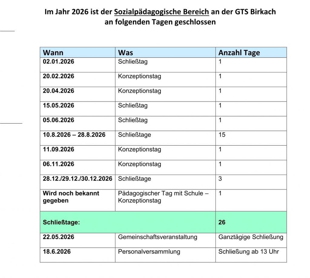 Schließtage des Sozialpädagogischen Bereichs